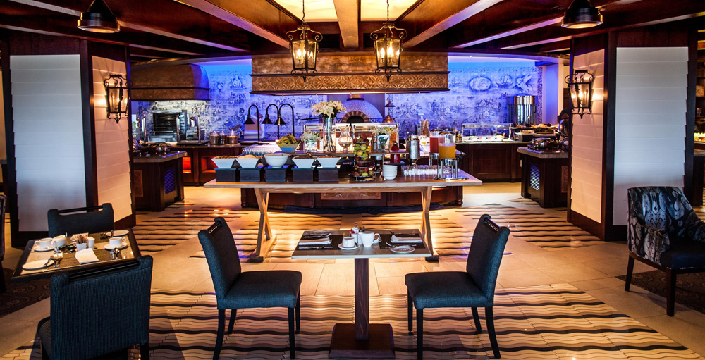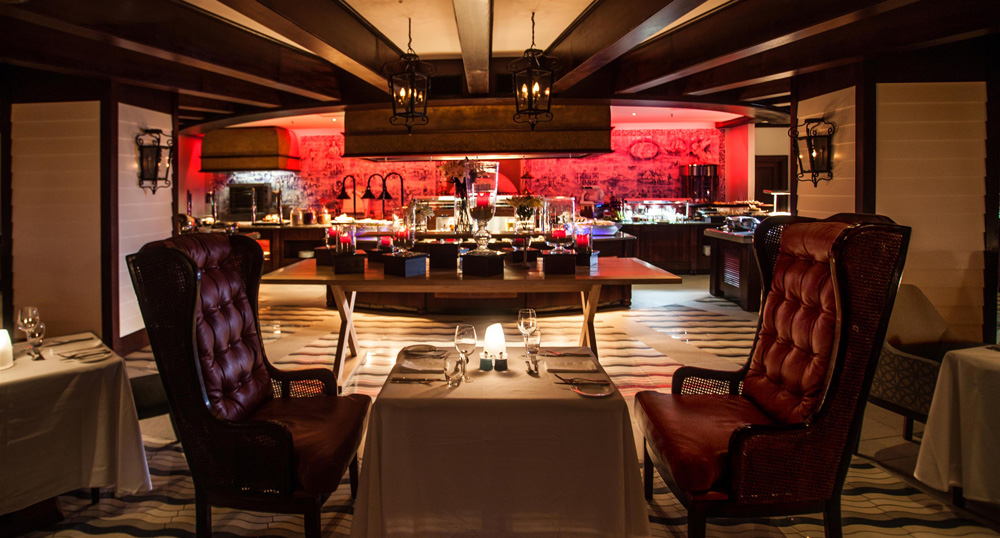 The mood changing restaurant is unique. It changes from a cool blue restaurant to a warm cosy red hued room at night. This is made possible by the use of colour changing LED lighting, furniture pieces which swop out and dressing of tables from day / night, which appropriately changes from informal during the day to formal at night.